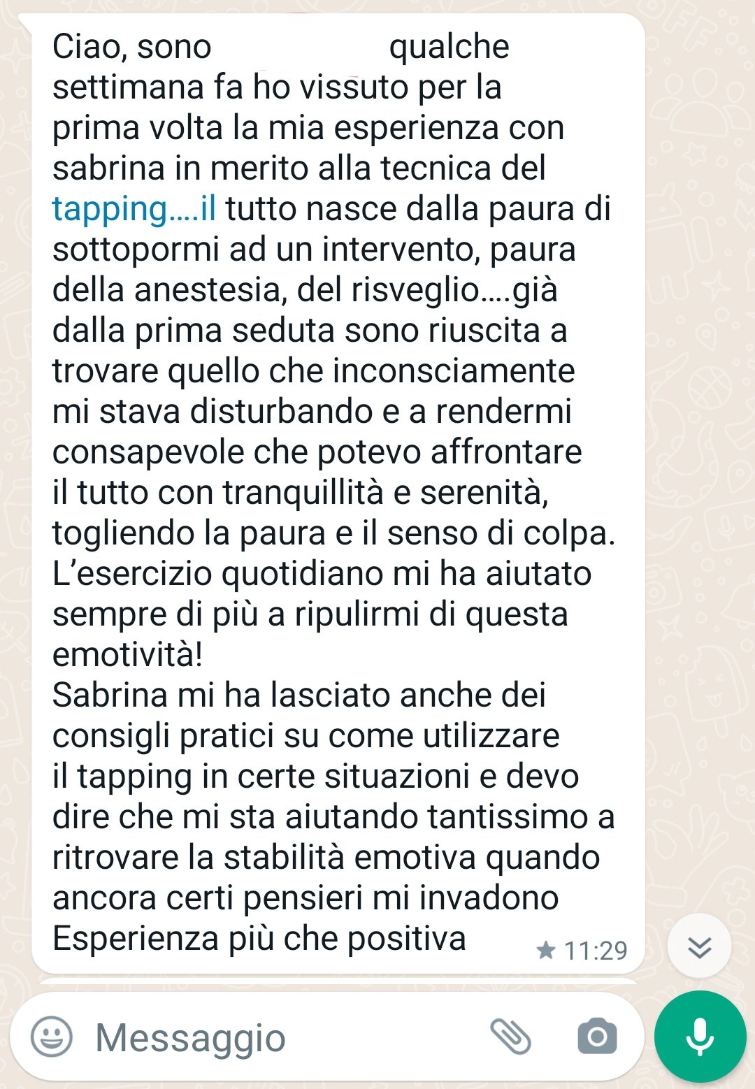 Il mio obiettivo principale come operatrice di EFT e tapping è quello di fornire un ambiente di supporto in cui i miei clienti possono esplorare e affrontare la loro sfera emotiva sviluppando nel contempo competenze che possono beneficiare del loro benessere a lungo termine.